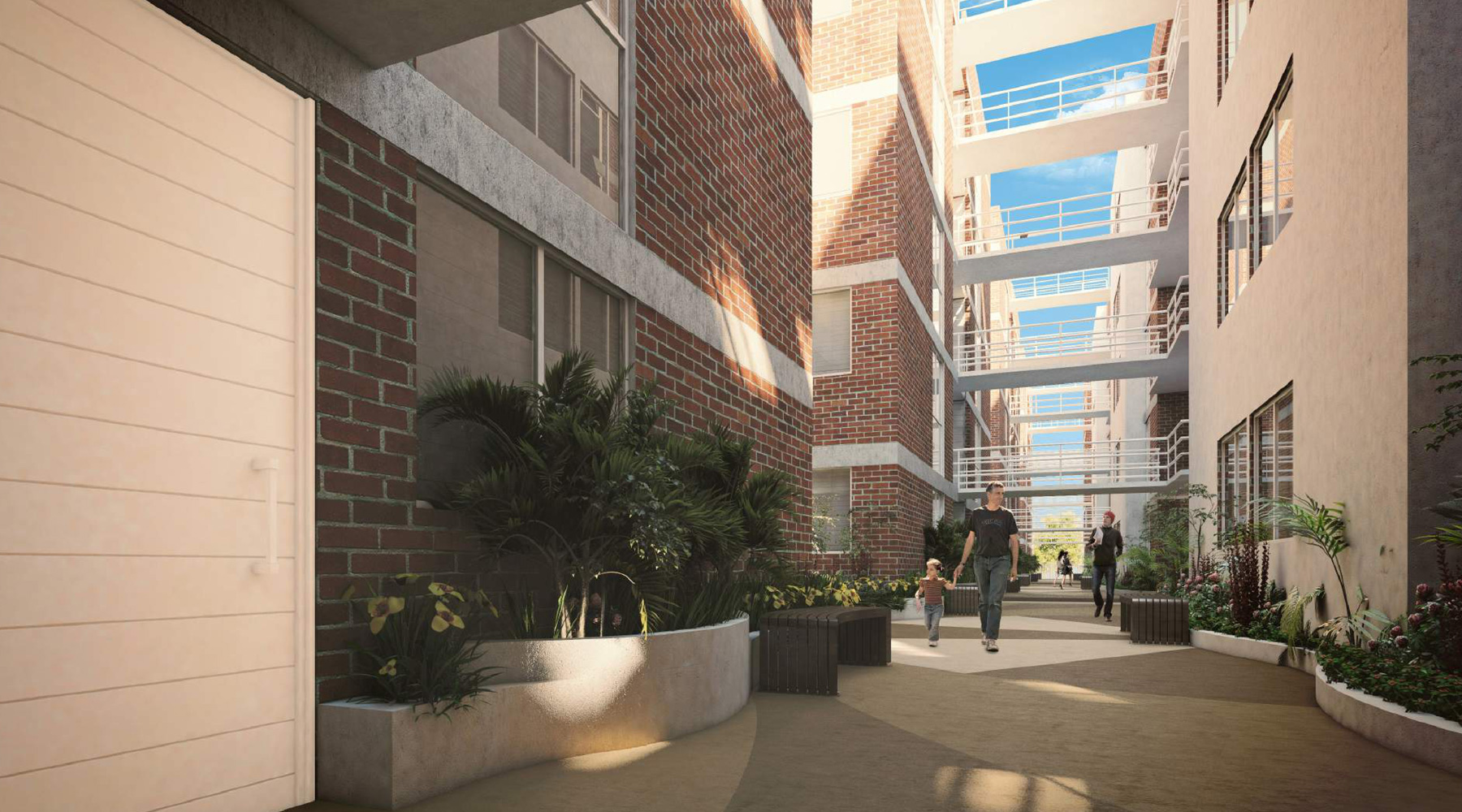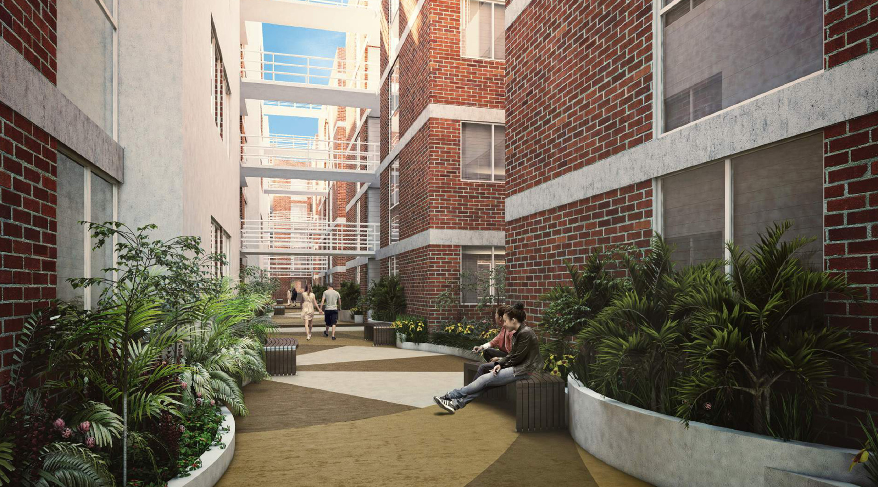 Los cuatro bloques habitacionales se desarrollan a lo largo de un “eje rector” longitudinal del terreno transformándose este en un “andar peatonal” como conector general, mismo que remata en una “plaza de dispersión general”.